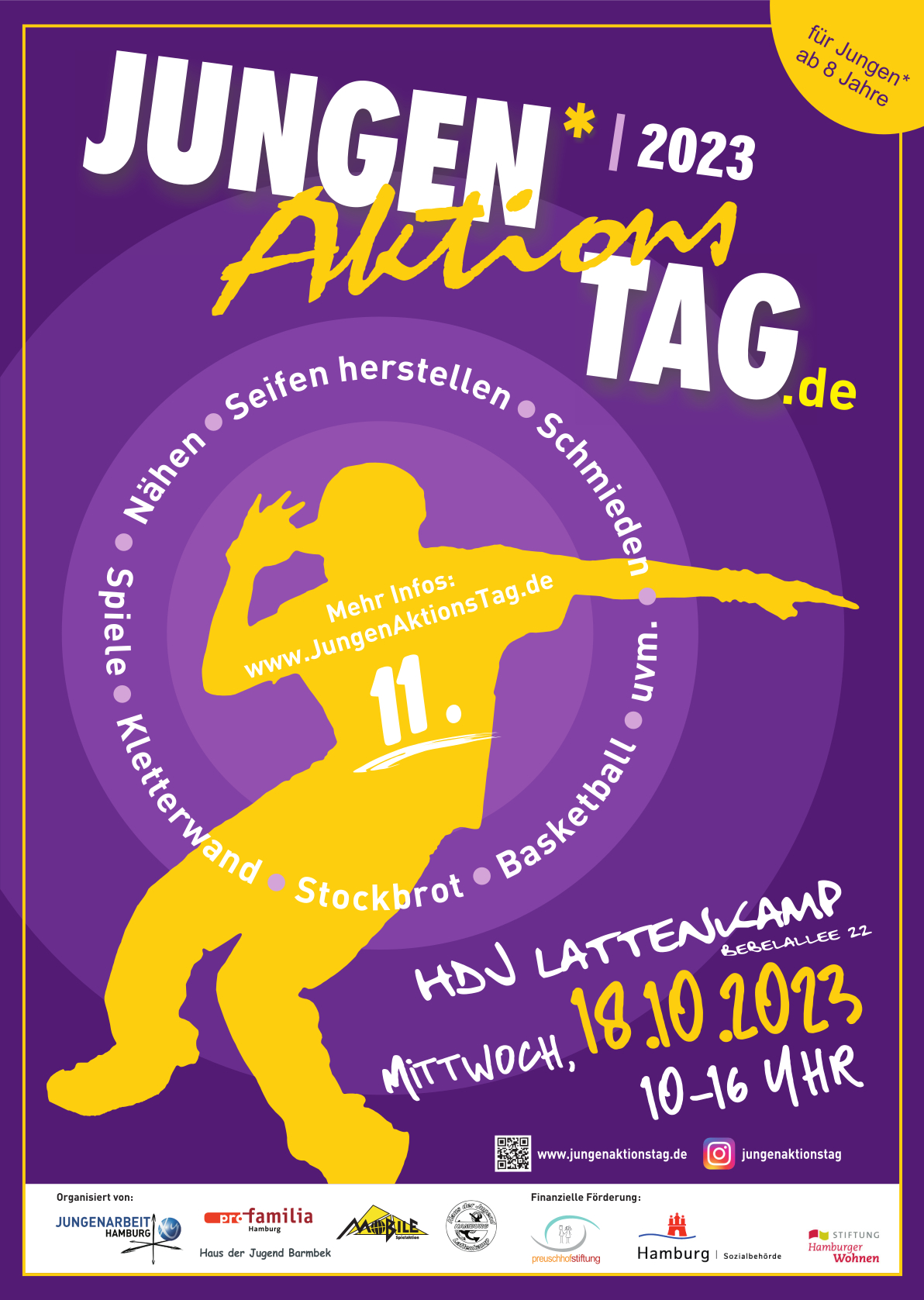 Ihr seid herzlich eingeladen, am 13. Hamburger Jungenaktionstag am 22. Oktober 2025 von 10 bis 16 Uhr teilzunehmen: Wie immer im Haus der Jugend Lattenkamp!